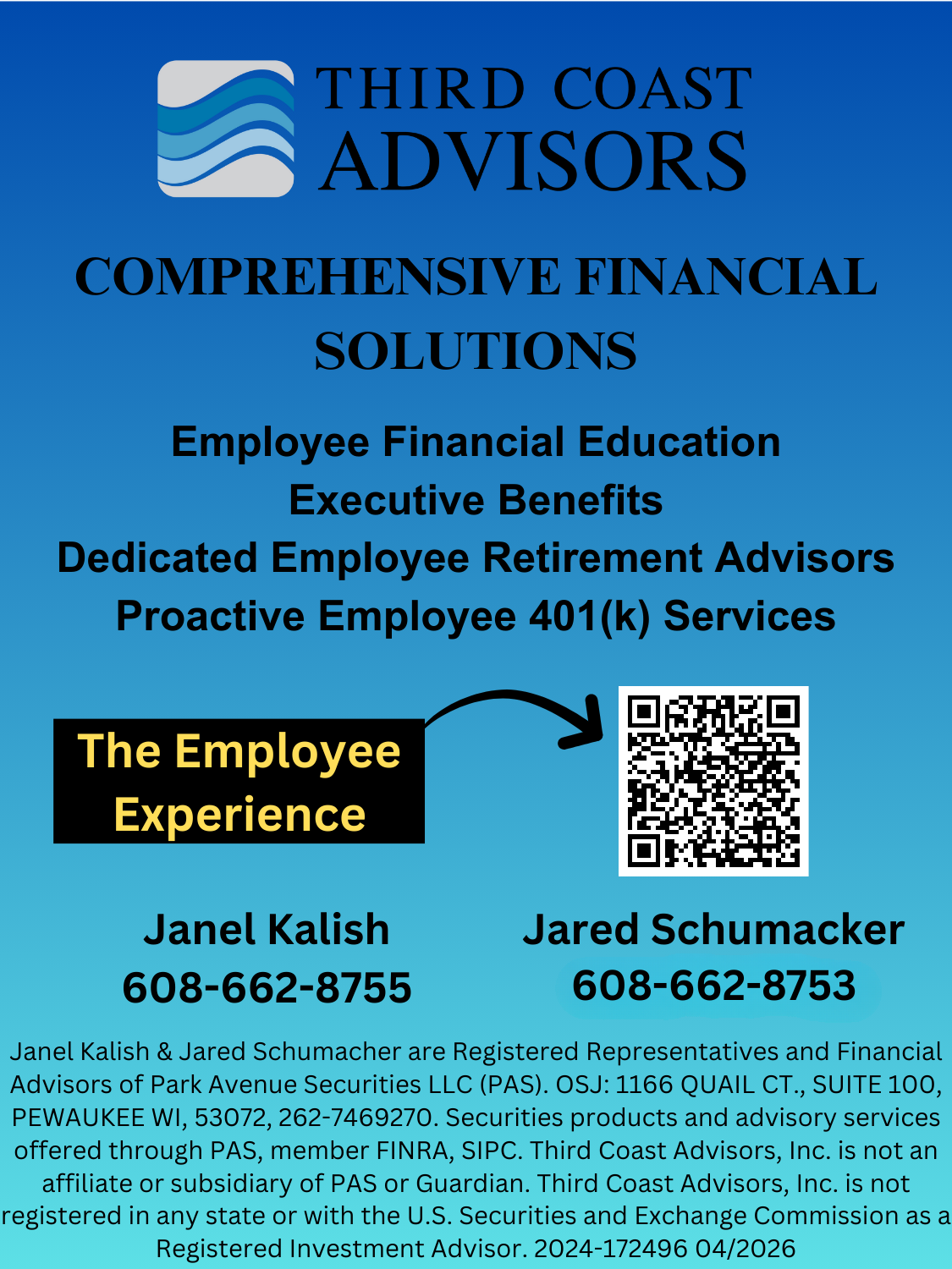 Janel Kalish, CFP & Jared Schumacher are Registered Representatives and Financial Advisors of Park Avenue Securities LLC (PAS). OSJ: 1166 QUAIL CT., SUITE 100, PEWAUKEE WI, 53072, 262-746-9270. Securities products and advisory services offered through PAS, member FINRA, SIPC. Third Coast Advisors, Inc. is not an affiliate or subsidiary of PAS or Guardian. Third Coast Advisors, Inc. is not registered in any state or with the U.S. Securities and Exchange Commission as a Registered Investment Advisor. 8080742.1 exp. 06/27